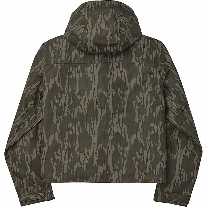 - Camouflage hunting jacket made with signature filson oil finish shelter cloth printed in bottomland, the original mossy oak pattern